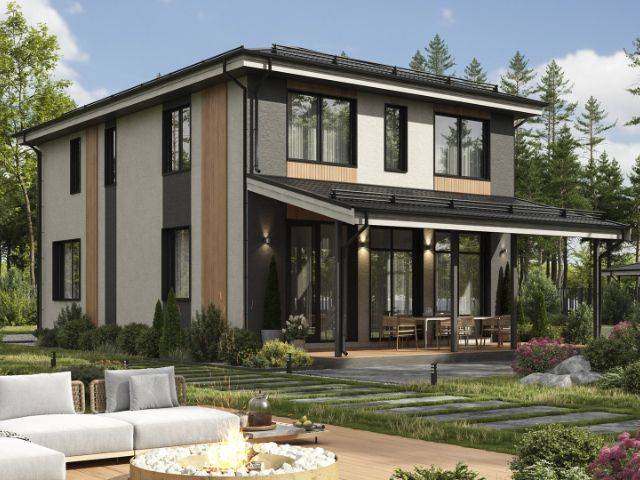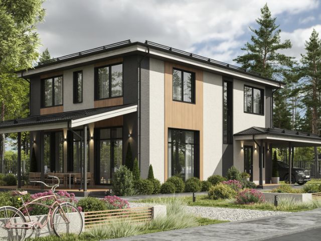 Одноэтажный дом «Даррен city» с тремя спальнями, кухней-гостиной, гардеробом, котельной и террасой. Стильный, простой, с хорошей планировкой и большими окнами. Идеален для семьи с двумя детьми — можно выделить каждому члену семьи свою комнату. Подходит для постоянного проживания.