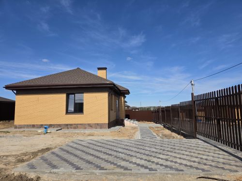 Установлены автоматические ворота, выложена площадка из брусчатки, участок огорожен (металлопрофиль).