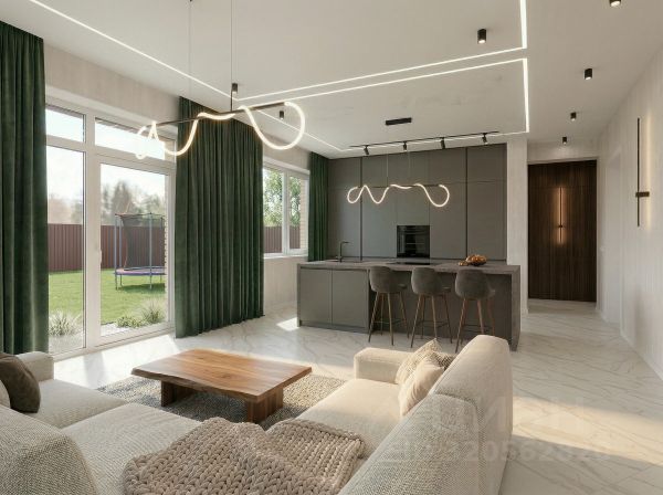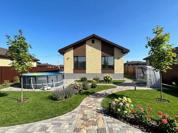 Одноэтажный дом из газобетона под ключ. В доме 3 спальни (одна мастер-спальня с СУ и гардеробом), два санузла, зимняя терраса, летняя терраса, гардеробная, кухня-гостиная 36 м2.