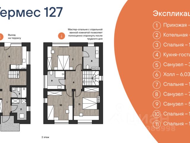 - 2 этаж: коридор 15,1 кв.м; комната 29,6 кв.м, ванная 7,3 кв.м; туалет 2,7 кв.м. Высота потолков 3,04 м