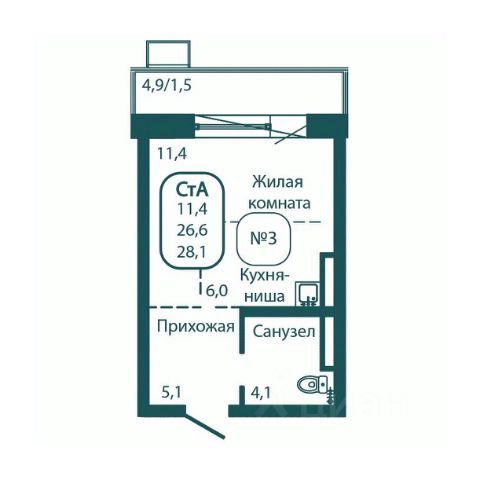 Общая площадь — 46,5 кв.м