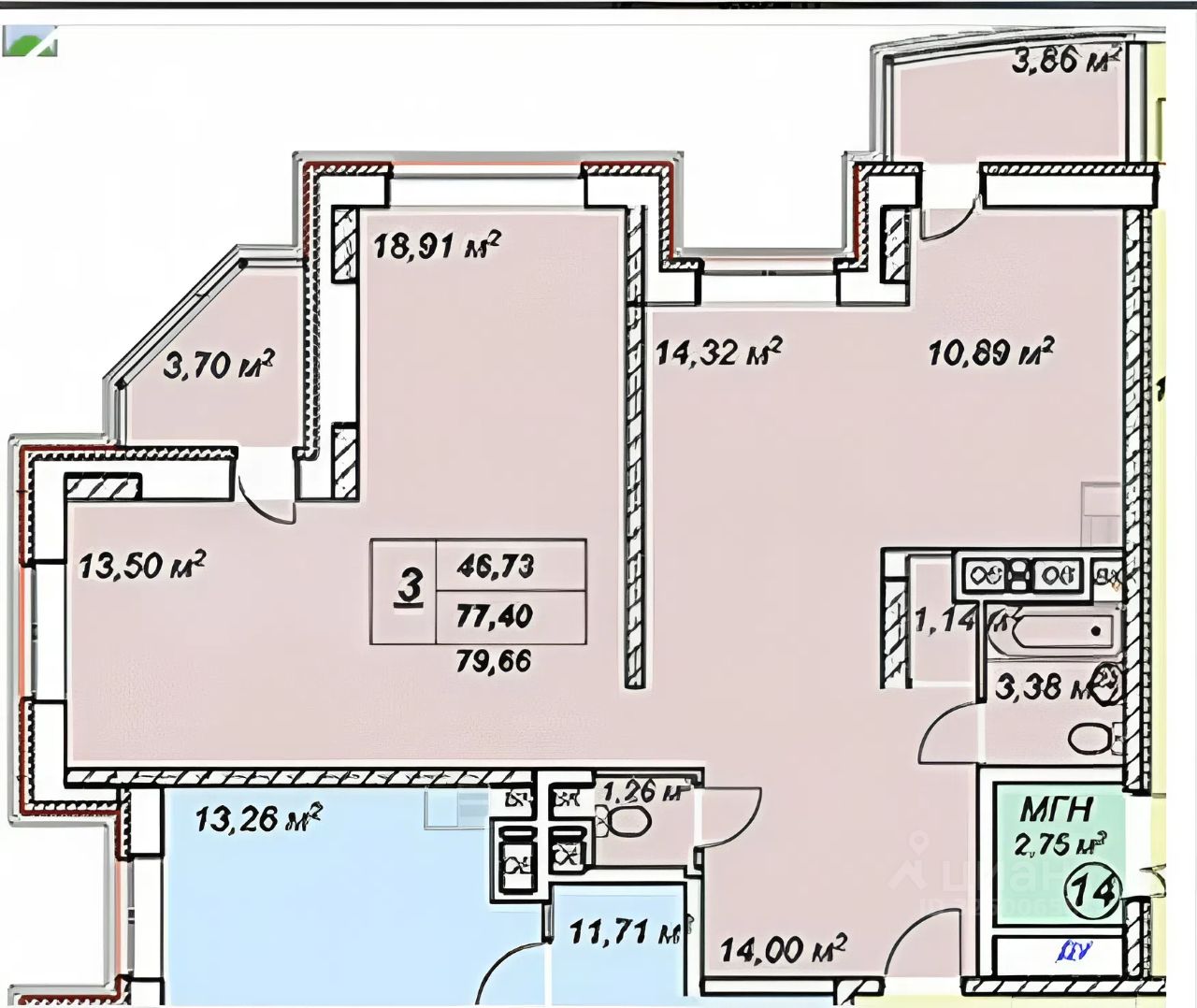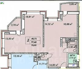 Площадь квартиры: 77 м², 3 отдельные комнаты.