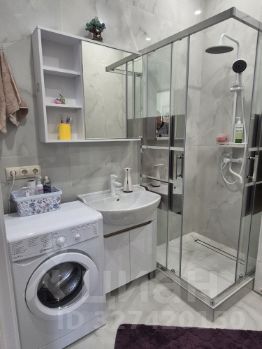 В ванной комнате установлена стильная душевая кабина и стиральная машина.