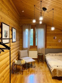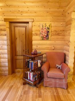 1 этаж - предбанник, прихожая со встроенными шкафами, кухня - столовая, гостиная с действующим камином, большая спальня с зоной кабинета, санузел с душевой кабиной.