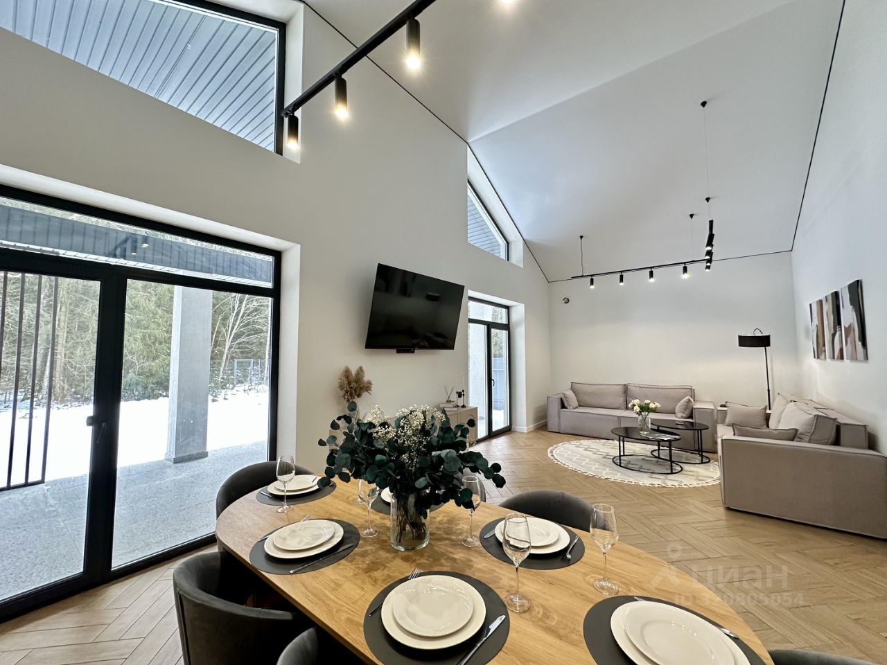 - Просторная кухня-гостиная 40 м² с 5-метровым потолком и панорамными окнами на лес