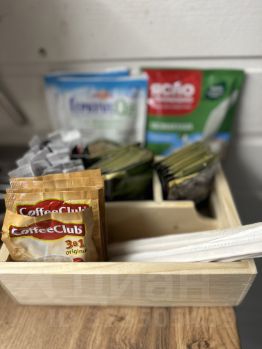 Набор продуктов для завтрака: чай, кофе, сахар, молоко, каши в индивидуальной упаковке.