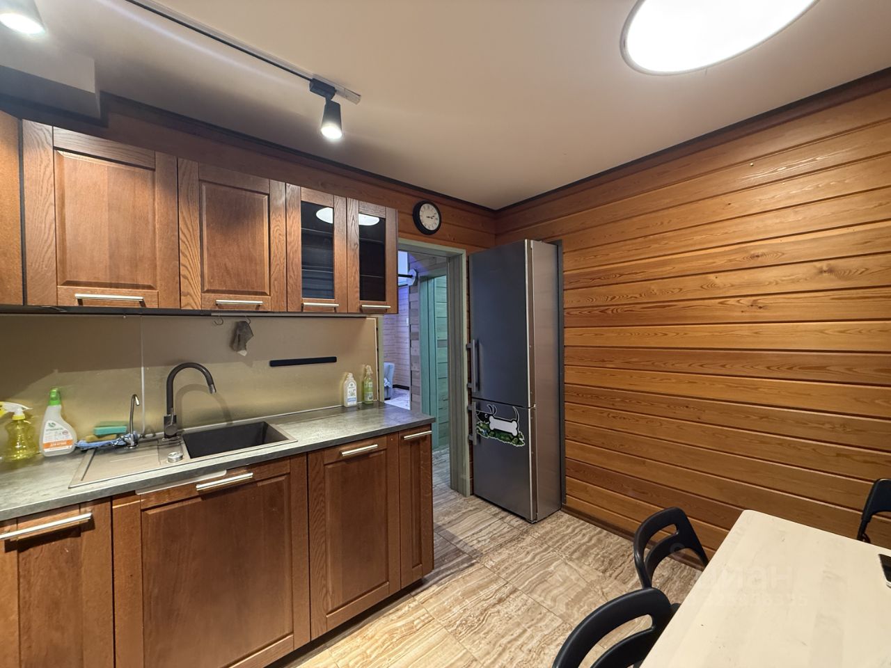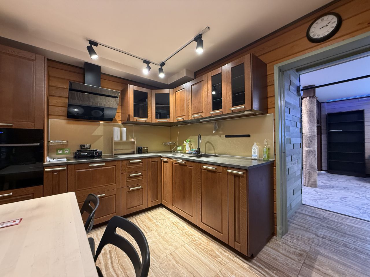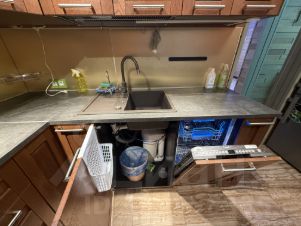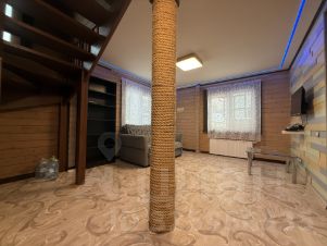 Первый этаж представляет собой просторную и светлую гостиную с диваном и телевизором, современный санузел со стиральной машиной, а также большую кухню, оснащенную современной бытовой техникой: духовкой Samsung, электрической плитой Gorenje, мощной вытяжкой, посудомоечной машиной Bosch, холодильником Liebherr и системой фильтрации воды Aquaphor. Просторная прихожая оснащена вместительными шкафами и одновременно служит помещением бойлерной, где расположен котел отопления, нагреватель воды, электрощиток с индивидуальными автоматическими выключателями и устройство защитного отключения (УЗО).