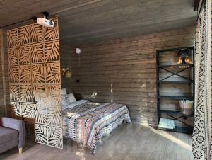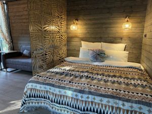 Для гостей предлагается 13 вилл. В них есть все для комфортного проживания гостей: удобные спальные места с чистым постельным бельем, прекрасный вид на лес через панорамные окна, раскладной просторный диван, терраса с уютным уголком. В домах присутствует посуда для приготовления пищи, варочная панель, холодильник и микроволновая печь.