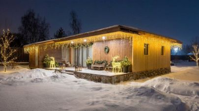 Одноэтажный дом 100м2 с панорамными слайдерами, 2 комнатами, залом для большой компании вместимостью до 20 человек.