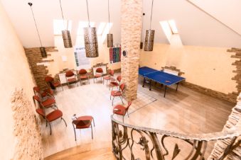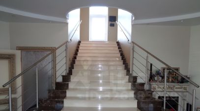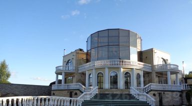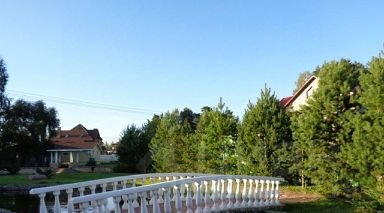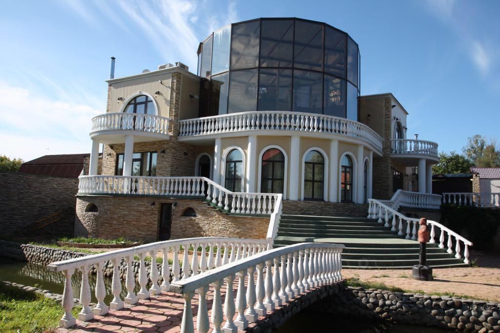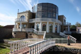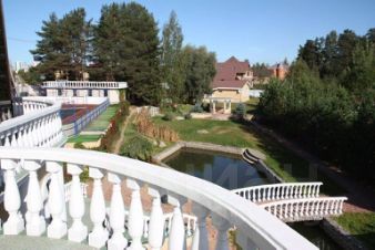 Коттедж располагает залом для банкетов и отдыха, который идеально подходит для проведения тренингов, дней рождений, свадеб и других мероприятий. Участок оформлен с каскадом фонтанов и рекой, проходящей через территорию. Здесь высажены хвойные и лиственные деревья, разбит газон, а также созданы уютные беседки и места для барбекю.