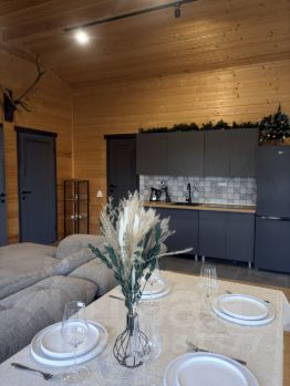 Кухня и гостиная: кухня, оборудованная всей техникой, варочная панель, микроволновка, холодильник, чайник, вытяжка и вся необходимая посуда (тарелки, салатники, стаканы, бокалы, столовые приборы (на 10 персон), разделочные доски, ножи, кухонный стол и стулья. + дополнительные стулья! Минибар также в зоне кухни: кофе, чай, сахар.