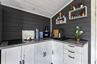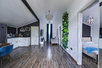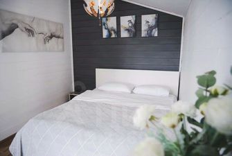 "Барнхаус 4 - это комфортный вариант размещения для всей семьи. В доме 2 отдельные спальни, большая обеденная зона, просторная кухня, в зале есть большой телевизор и умная колонка Алиса. Для дополнительного размещения гостей в зале расположен диван-кровать. Светлый дизайн дома создает праздничное настроение. А растопленная баня* и банный чан* на территории дома придаст атмосферу уюта и уединения.