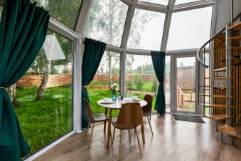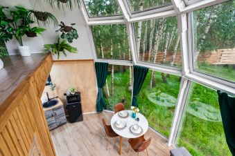 Дом "Сфера" самый необычный домик на нашей базе. Форма дома придает уютную и загадочную атмосферу, здесь Вы можете одновременно воспользоваться баней и чаном*, такая смена обстановки подойдет для людей ищущих чего-то нового для себя.