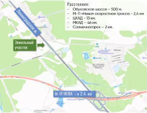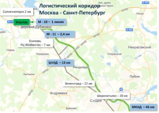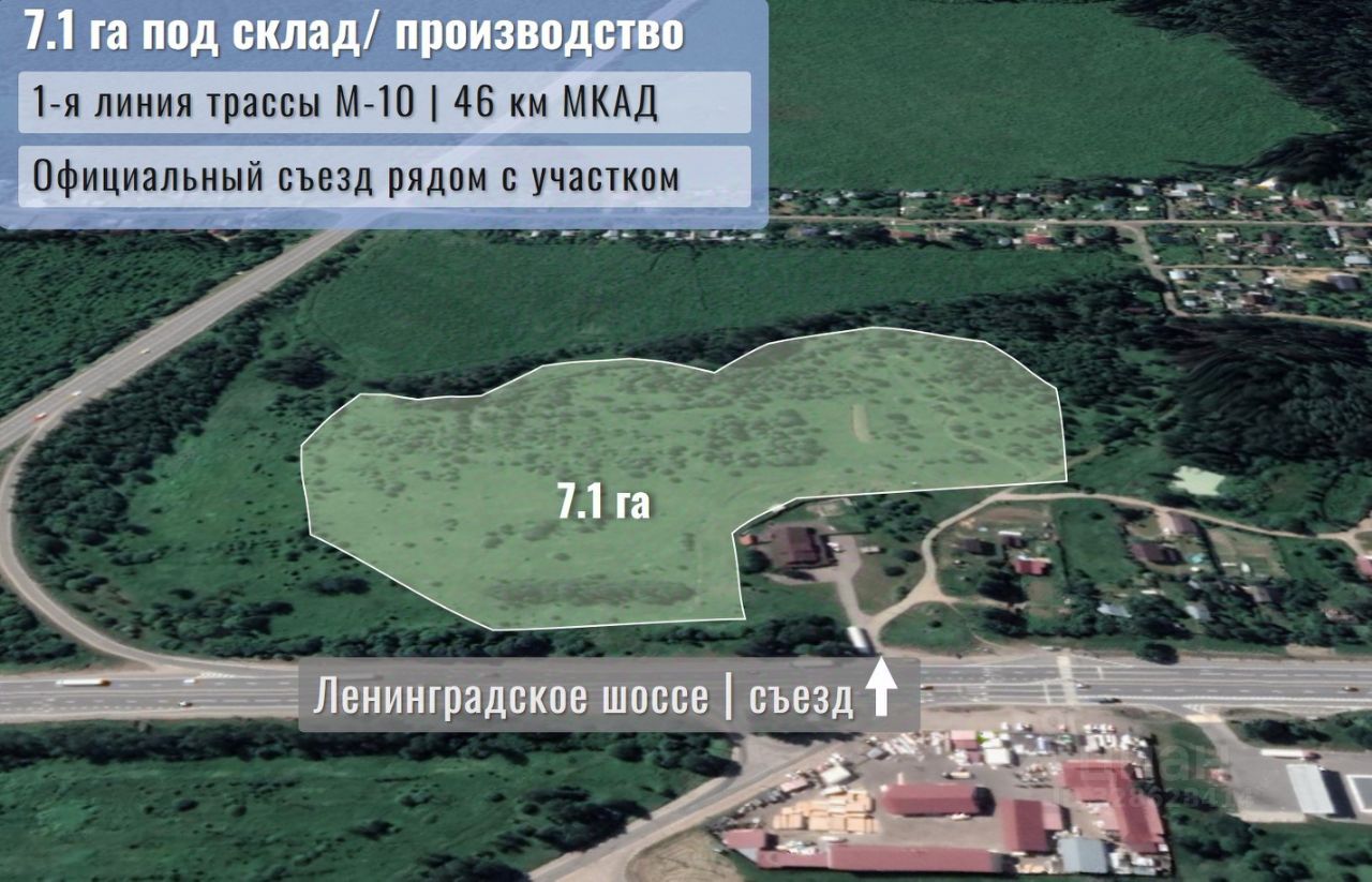 Участок расположен на первой линии федеральной трассы М-10. Официальный съезд с трассы рядом с участком. Скоростная трасса М-11 - в 2.4 км, что обеспечивает удобную логистику. Фасад вдоль Ленинградского шоссе - хорошая видимость с трассы.