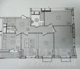 Общая площадь 77,4 кв.м, все комнаты изолированные: 16+12,5+10+10 кв.м, квадратная кухня 8,5 кв.м, 2 санузла, просторная лоджия на кухне остеклена, но без отделки.