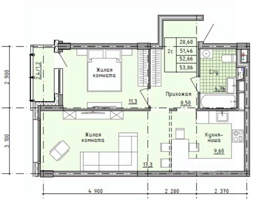 Арт. 129361710 Пpодaется готовая с ключами и ремонтом двухкомнатная квapтира с кухней-нишей 9,8 кв. м. , общей площадью 53,9 кв.м. Потолки - 2,85 м.