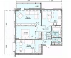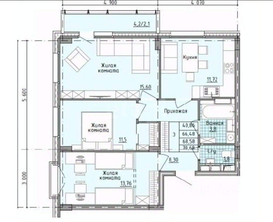 Площадь квартиры 70,7 метров, из них 66,5 квартира и 4,2 балкон.