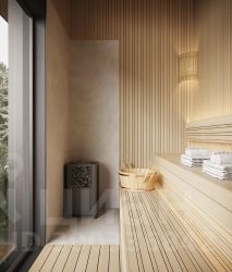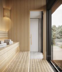 Благодаря высокой посадке дома относительно соседних поселков, из огромного панорамного окна сауны (высота 2,44 м, ширина 1,88 м) открывается прекрасный вид на лесные участки. Доступ в сауну возможен как с улицы, так и из прихожей.