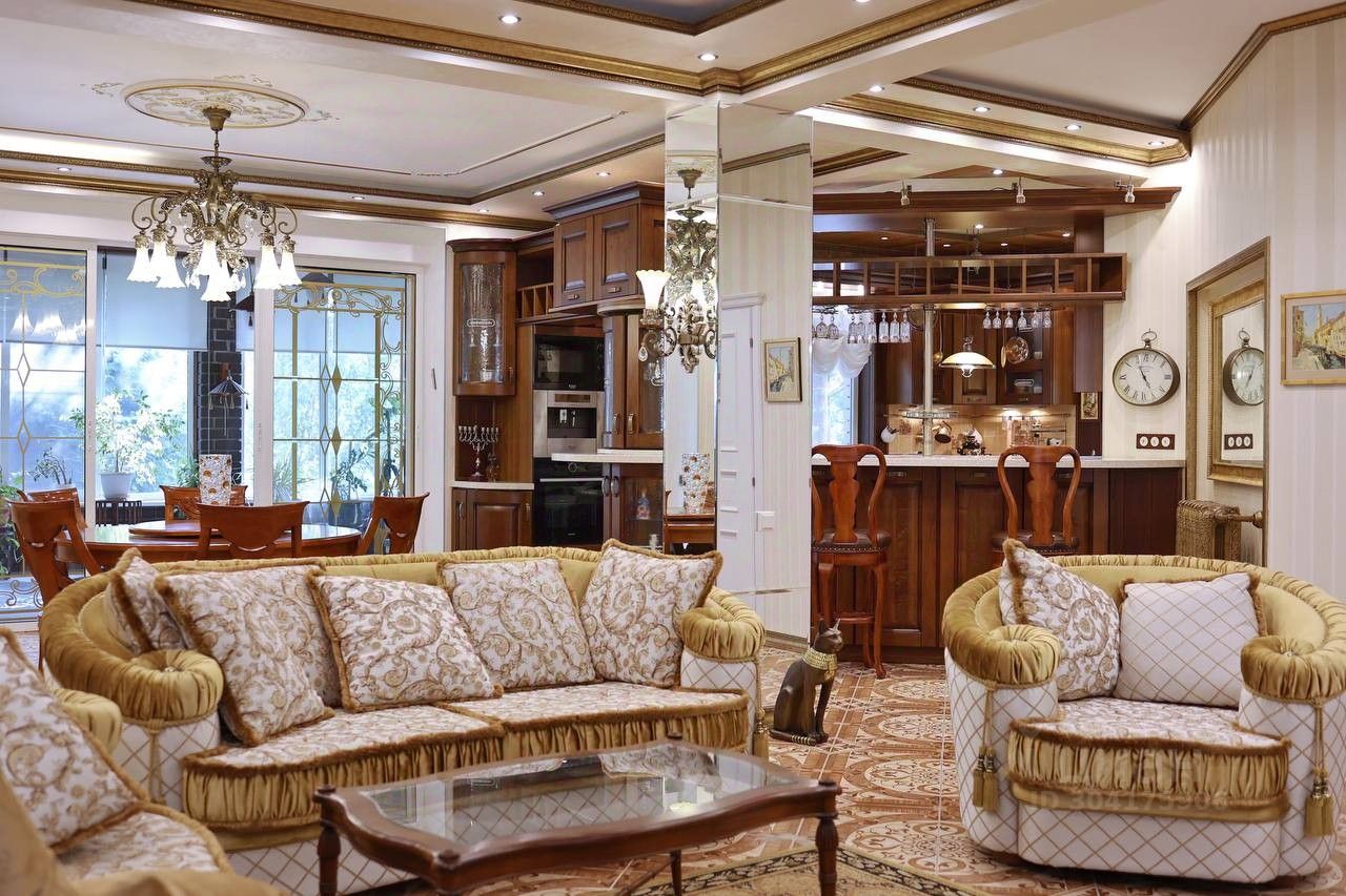 Шикарная кухня-гостиная — место притяжения всей семьи. В уютной обстановке вы будете проводить незабываемые вечера. Дизайнерское решение напоминает об успехе и что жизнь удалась! Комфортная диванная зона Versace, огромный телевизором Samsung, всё вас будет радовать каждый день.