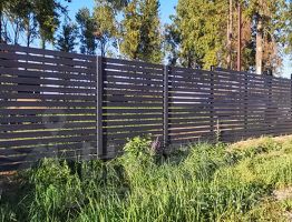 Забор по периметру, фасад - шлифованная доска под покраску декоративным антисептиком, распашные ворота.