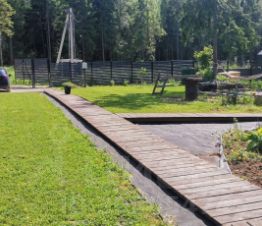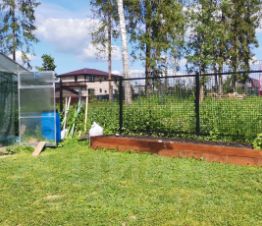 Участок: выполнено выравнивание, газон - клевер. Теплица 3*4м, 2 высокие грядки. Деревянные высокие дорожки, заезд на 2 машины.