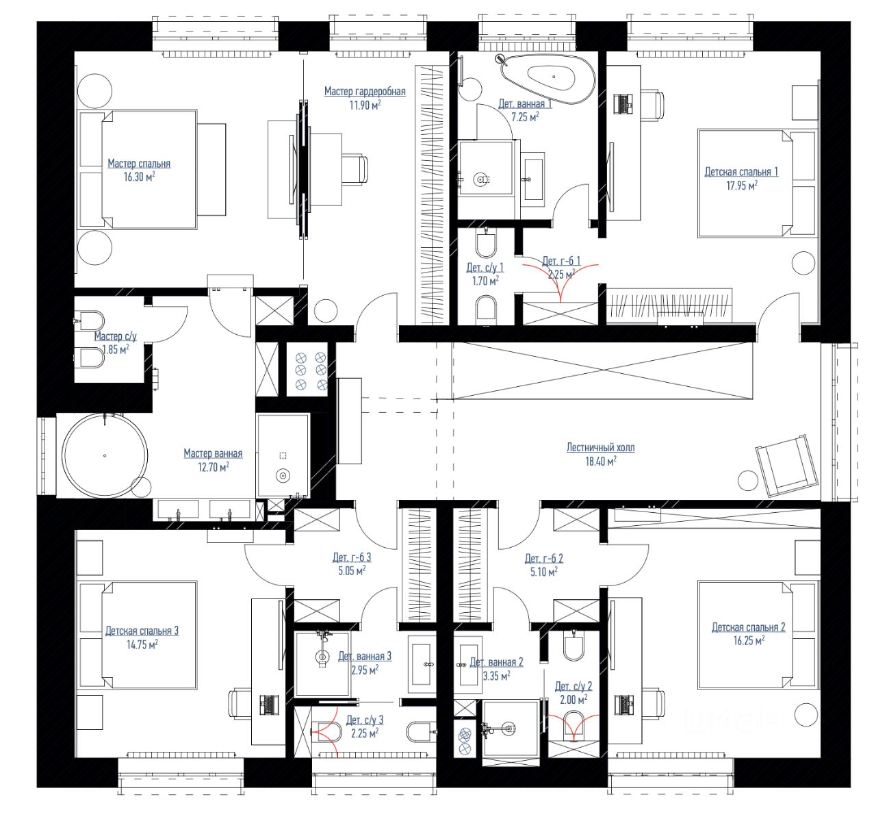 Мастер-спальня - это ваш личный оазис спокойствия. Рядом - гардеробная мечты, где поместится гардероб всей семьи, и еще останется место для сезонных вещей.