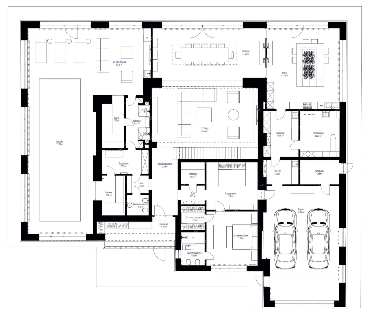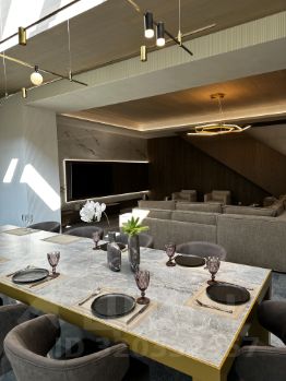 Войдя в дом, вас встречает просторный холл, который плавно перетекает в огромную гостиную-столовую - настоящий центр семейной жизни. Панорамные окна в пол, через которые льется естественный свет и открываются завораживающие виды на природу.