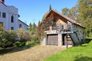На территории размещены: гостевой летний домик, здание для персонала площадью 80м2, парковка и гараж на три машины.