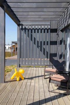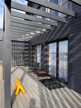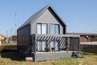 Не обычный дизайн виден уже снаружи дома. Брутальный и выделяющийся темный цвет дома, выглядит очень привлекательно. А шикарный и живой интерьер ощущается с порога дома.