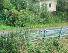 Участок ровный, огорожен — по периметру сетка, со стороны дороги деревянный штакетник