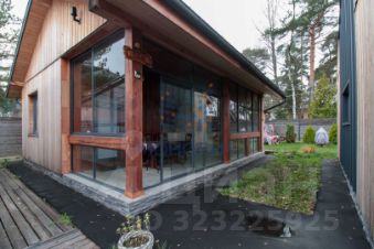 Фасад дома обшит лиственницей, установлены окна и входные двери Gеаlаn.