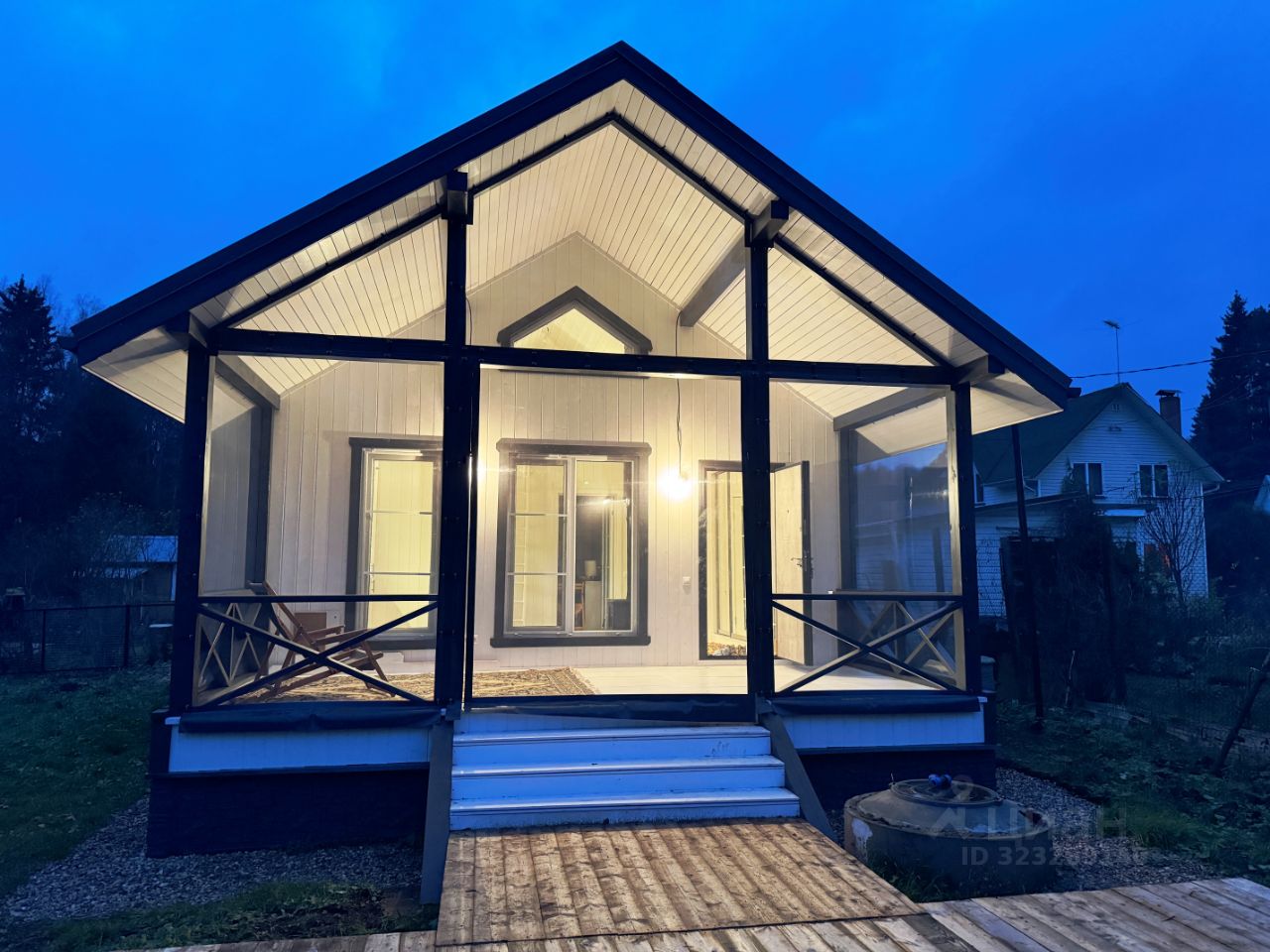 Дом 6 на 6 на свайно-винтовом фундаменте длиной 5 метров (между сваями геотекстиль и щебенка). Утепление 150 мм. Кровля - металлочерепица серого цвета с водостоками. Внешняя и внутренняя отделка - имитация бруса (заводская покраска). в доме терраса с мягкими стеклами, кухня, спальня, СУ и антресоль с кроватью. Перед домом большая деревянная площадка на сваях.