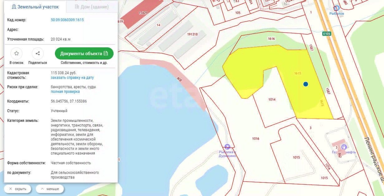 Продается участок на первой линии Ленинградского шоссе, рядом с ЦКАД. 27 км от МКАД. Кадастровый номер 50:09:0060309:1615.