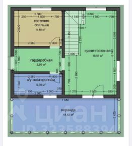 1 этаж: Просторная кухня-гостиная (19,6 м²) — сердце дома. Гостевая спальня (9,1 м²), большая гардеробная и санузел с постирочной зоной.