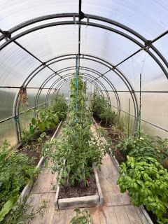 На придомовой территории расположился собственный сад с плодоносящими деревьями, теплицами и курятником.
