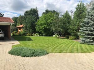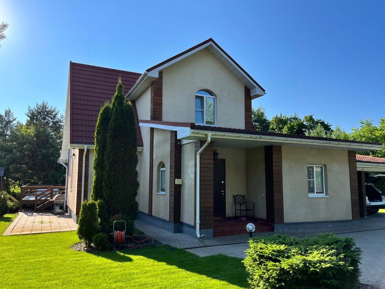 -Участок прямоугольной формы, засеян газоном, посажены деревья и кусты ценных пород. На участке расположена баня 58кв.м. с кухней, санузлом.