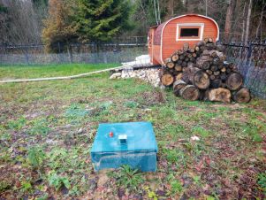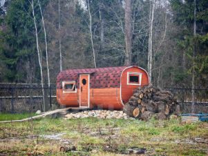 На участке вас ждет готовая к использованию бочкообразная баня и удобный навес для автомобиля.