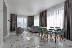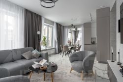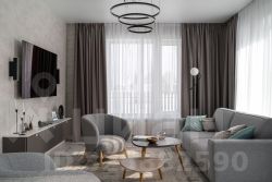 Планировка включает просторную кухню-гостиную, 3 спальни и 2 сан узла.