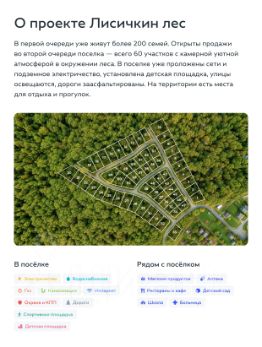 Представьте, в городе — суета, пробки, душный воздух. А Вы в Лисичкин Лесе. Выходите на веранду собственного коттеджа. Лес вокруг, озеро в пешей доступности, тишина и душевный покой. Дети здесь дышат чистым воздухом, играют без страха. Магазины, школы, инфраструктура — всё рядом. И да, работа в Москве — но это уже не преграда. 30 минут — и Вы на работе, 30 минут и Вы уже дома. Лисичкин Лес — это место, где счастье перестает быть проектом и становится реальностью.