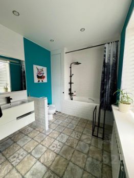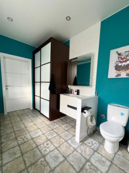 Совмещенный санузел 11 кв.м, пол с подогревом керамогранит, ванна, унитаз, раковина, встроенный шкаф.