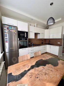 Кухня 11.7 кв.м, пол с подогревом керамогранит (кухня встроенная с газовой варочной панелью и электрическим духовным шкафом, встроенной микроволновой печью, встроенная посудомоечная машина, вытяжка),