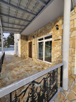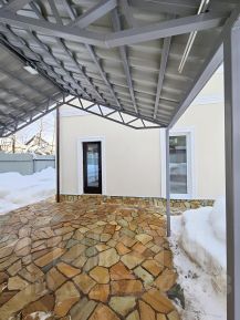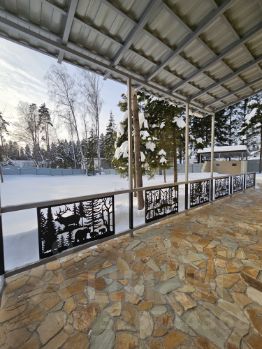 Участок: лесной 11,13 соток, огорожен забором из металлопрофиля и оснащен откатными воротами (привод для откатных ворот R-TECH с магнитными концевиками). Барбекю зона выложена из газосиликата и отштукатурена Короедом в стиль дома, парковка с навесом на два автомобиля из металлочерепицы. Дорожки, барбекю зона, парковка, как и дом вымощены натуральным камнем. Сарай из металлопрофиля.