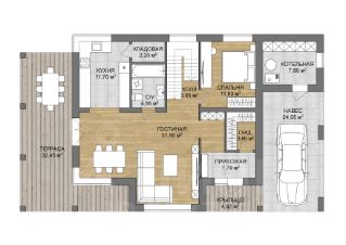 В доме есть все необходимые помещения: просторная кухня-столовая с выходом на террасу, четыре спальни, две из которых мастер-спальни, четыре санузла и вместительные гардеробные. Внешняя отделка дома может быть выполнена в различных цветовых решениях. Современный проект дома популярный выбор большинства семей.