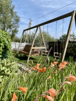 На участке: качели, мангальная зона, у каждого дома своя зона отдыха, теплица 2,5*4 с открывающимся верхом, хозблок, дровница, посажены флоксы, гортензия, гладиолусы, малина, яблоня, туи.