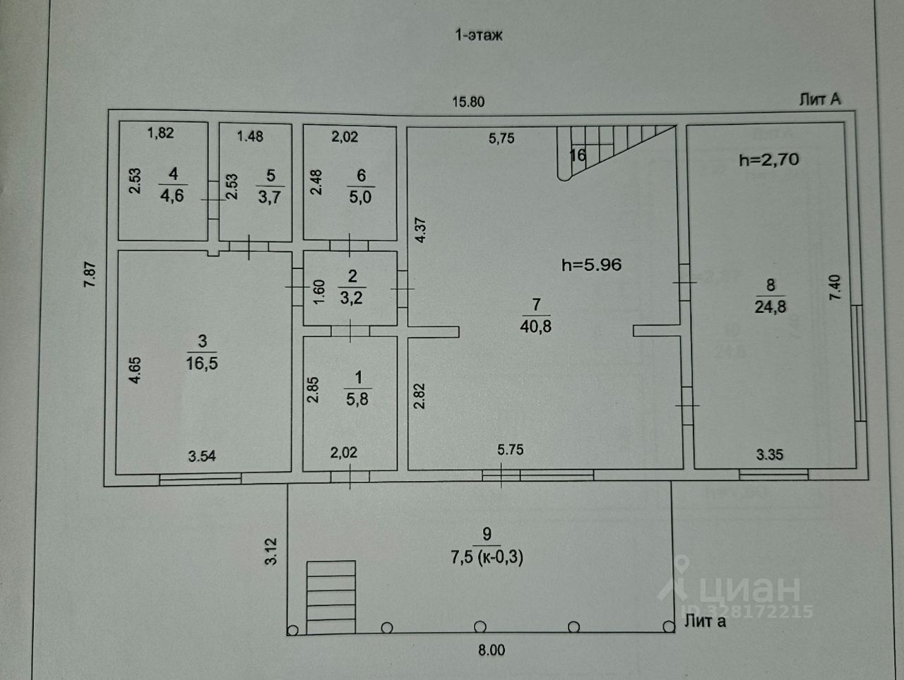 1й этаж: веранда 21 кв.м.; прихожая 5.8 кв.м.; первый совмещённый сан.узел; комната 16.5 кв.м. с двумя кладовками 3.7 и 4.6 кв.м.; кухня-гостиная с лестницей на второй этаж 40.8 кв.м.; комната 24.8 кв.м.