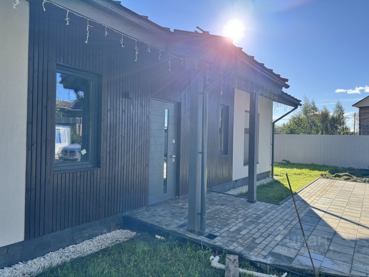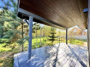 Удачная планировка участка. Задний двор и терраса выходят на южную сторону с видом на сосновый лес. Участок примыкает к лесу. Территория участка благоустроена: по периметру забор, при въезде парковка на 2 машины, по периметру дома отмостка из декоративного щебня, газон, на заднем дворе взрослые лесные деревья. По участку выполнена разводка под автополив, есть подземная буферная емкость на 1200л; также индивидуальный септик, скважина, дренажная система, ливневая канализация, закладные под откатные ворота, гараж. Электричество 15кВт, газ по границе участка.