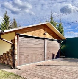На въезде на участок мощеная плиткой парковка и капитальный гараж на 2 машины со стеллажами и верстаком.