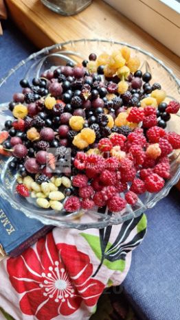 Участок правильной прямоугольной формы, огорожен по периметру. На участке высажено множество декоративных растений, растет земляника, малина, смородина.